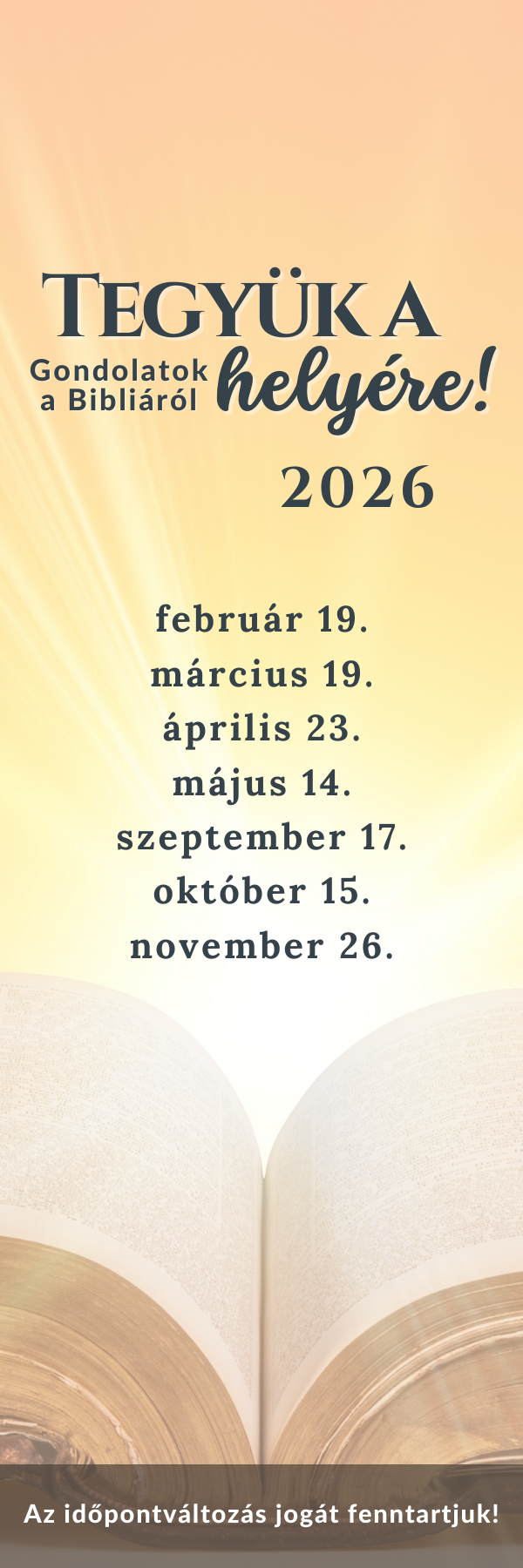 Tények és tévhitek számtalan megannyi formája öltött testet az évszázadok alatt a Bibliáról. Nem kevesebbre vállalkozunk mint egy közös útkeresésre az igazságban. A Tegyük a helyére! – gondolatok a Bibliáról című sorozatban olyan bibliai és teológiai értelmezések kerülnek a középpontba, amelyek feltárják Isten megmentési tervét az emberiség számára. Interaktív formában lehetőség nyílik a hallgatóság számára kérdés-felelet keretei között különböző nézőpontok egyeztetésére.